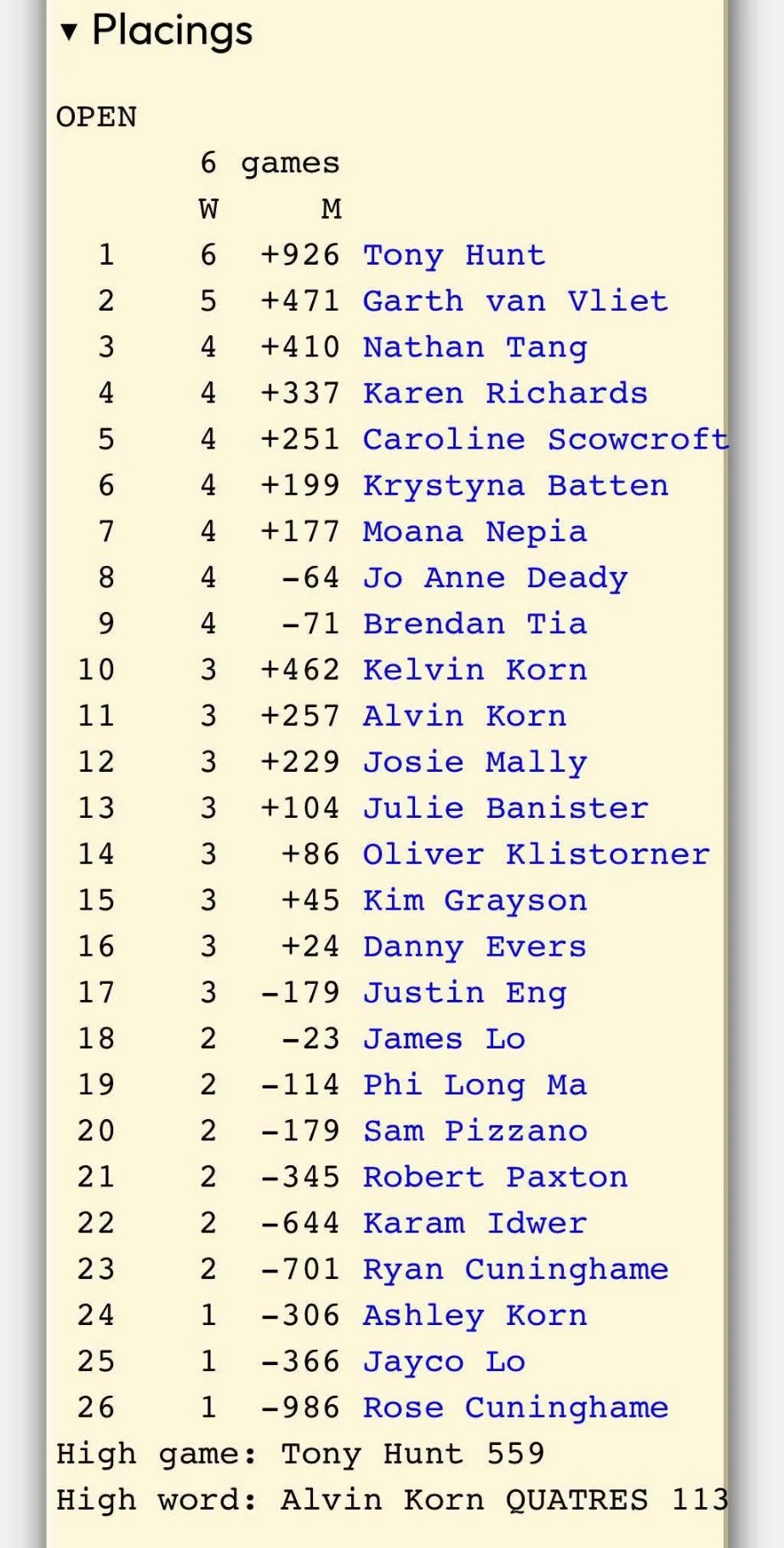 Every Tuesday, at 10am, about six keen players meet in the lower room at Oatley RSL Club for 4 or 5 social games. But on Tuesday 15th July, things heated up a bit. As well as the Oatley regulars, a total of 26 players, including 14 YASPA youth players, 3 players from interstate as well as parents, grandparents, siblings and supporters. This was the 17th tournament of the OITOO* format, and YASPA’s first supported tournament. The young players ranged in age from 6 to 16 and were divided into 3 age categories for the purpose of trophies - but all players, including the adults, were in the same “division” - meaning that any player could play any other player. The rationale behind this approach is to allow the children to be matched with experienced players, and to also give the older players a chance to verse children, and to pass on their tips, and in some cases, pass on some ratings points. Thanks to the AJSC, we welcomed three new young players to the open tournament scene, Ryan, Rose and Karam. It was also great to see Sam who flew in from Canberra, supported by his grandmother. Karen Richards, the CASPA Australian Youth Coach, who ran a WYSC coaching session the day before, also played. In Round 1, Josie Mally set a high bar with a 99 point high word. Josie looked strong to win the high word prize going into the final round. Then there was flurry of high word activity with Brendan cracking the 100 mark, but not to be outdone, Kelvin reported scoring 113 for a nicely placed QUATRES. The tournament concluded with a rather irregular Mystery Words announcement - done with a live phone link to ASPA NSW committee member Chris O who made the words up on the spot, including one word that was a phoney. The other 3 were fine (TORNADOS, WINDOWS and FOLIO), but no one played these words, so the prize jackpots. Some acknowledgements: Thanks to Oatley RSL for the venue, Oatley Scrabble Club for allowing us to take over for a day, ASPA ACT and Karen for bringing clocks, YASPA committee members, Tisa Ng, Danny Evers and Aaron Korn for assistance on the day, and thanks to everyone who pitched in to allow us to run the 6 game tournament efficiently within the planned timeframe.