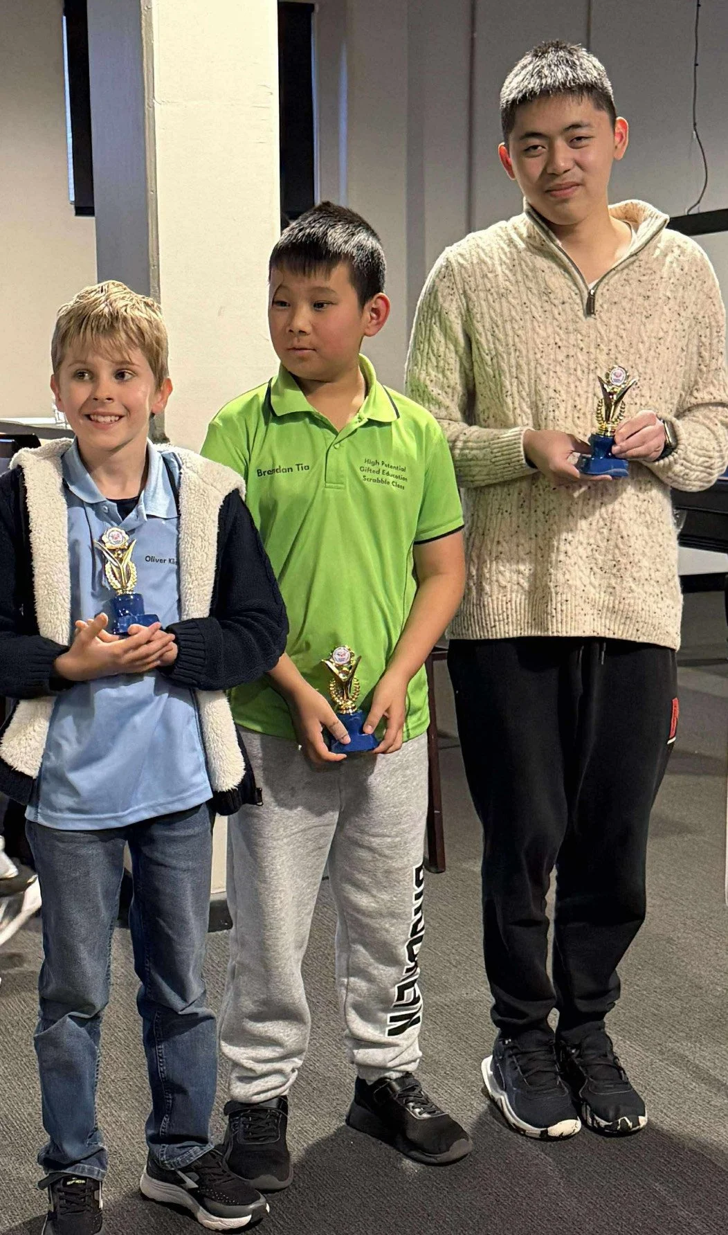 Fifty players from eight schools competed in the 4 game AJSC Qualifier. Of these, 26 played in their first ever ASPA rated event. Congratulations to Vinh Nguyen on taking out overall first place with 4 wins and a +655 margin. Congrats also to Brendan Tia on being the highest placed primary school finisher winning 4 from 4. And also, big congrats to Eric Phan (Year 3) on being the best performer in Years 1-3, finishing 5th overall. Also, great effort to the 6 players who played their first rated tournament and managed to win 3 from 4 games: Aaron T, John H, Huy L, Zachary S, Kelvin N, and Zachary Y. Awesome! Jeffery managed to snag a high word (100+) in round 1, only to be pipped by Eric P who played QUIZzED for 119 in the final round. There were plenty of ZA’s JA’s and XI’s, but some of the more interesting plays spotted were HYRAX (52 point opening play by Brendan), not to be outdone, Eric came back with QUAVERS (hooking S onto HE making SHE). A sample of some of the other interesting moves: SOARINGS (yes, it’s fine with an S, 80, Ashley), VENTURE (67, Albert), SLIMMER (86, Vinh), OUTLAWS (81, Kevin L), ZOMBIE (38, Thomas), Q bomb QI (64, Amy), POGO (37, Aaron), REPEATS (81, Phi Long), STICKED (78, Tristan, yes it was checked), KADI (56, Lucas). There were a few reported high words that I won’t put here because they were phonies! We did remind players that there is no penalty for challenging, but some still got accepted. Overall, as I walked around observing the games, I was impressed by the standard of words and the small number of phonies.